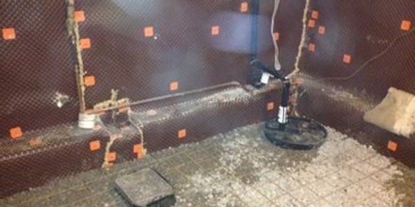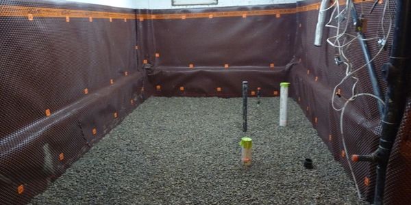 Once plumbing is complete floor is leveled, delta membrane is installed on all interior walls and a continuous clothed weeping tile system directed to a sump barrel.
